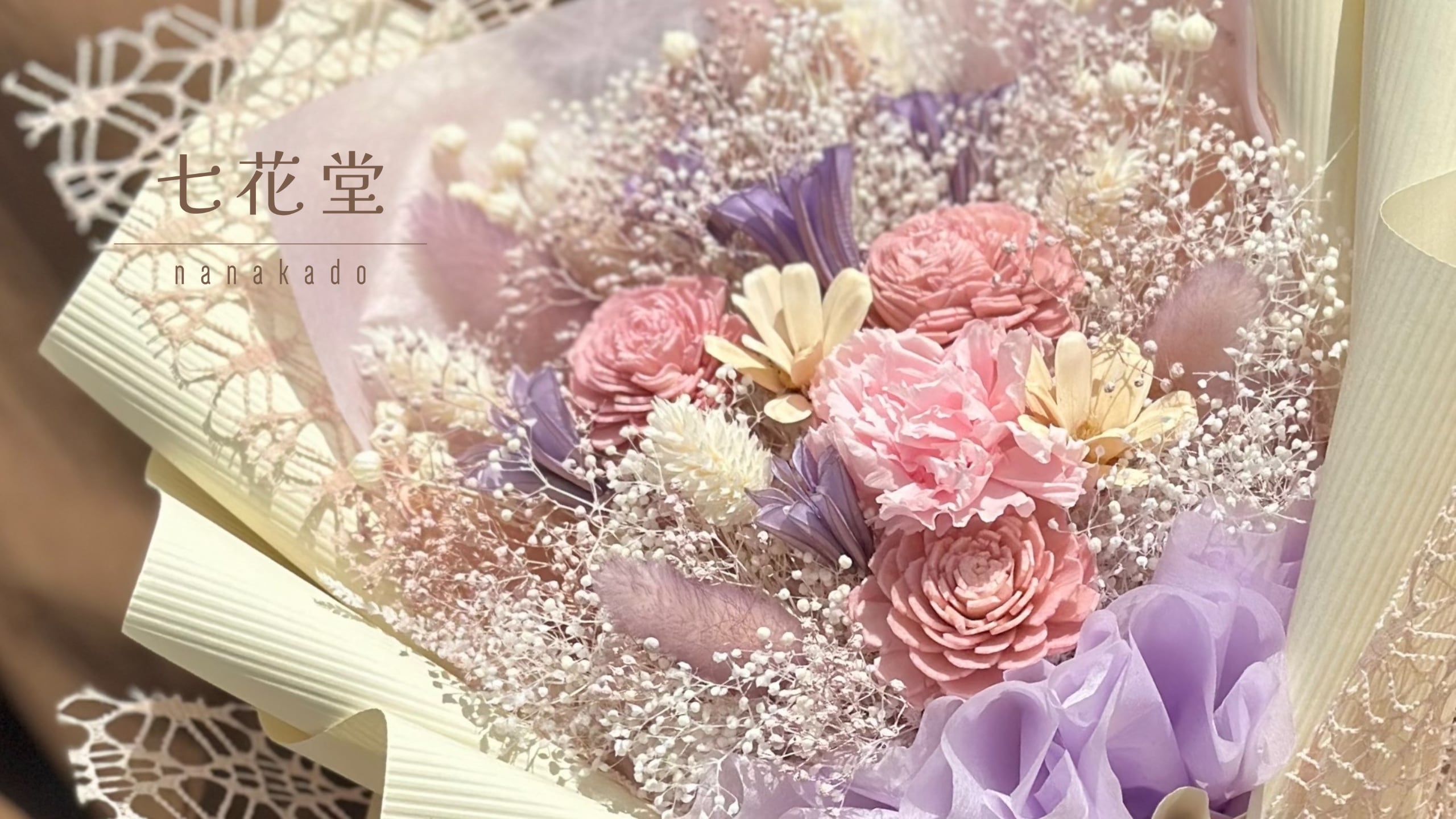 七花堂 nanakado 喜び・癒し・幸せ・楽しみ・思い出・色合い・自然 七つのコンセプトをお花に込めて、花づくりをしているドライフラワー専門店です。 ひとつひとつ丁寧にデザイナーが作成しています。 ご自身や大事な人へのギフトに特別なお花をプレゼントしてみてはいかがでしょうか。